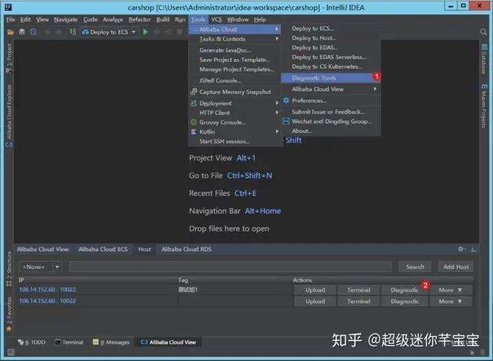 点击上图 1 所示Tools - Alibaba Cloud - Diagnostic Tools菜单,即可开始。 - 方式二:诊断远程机器上的 Java 程序