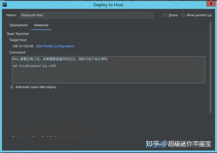 tail -f /root/act_tomcat/tomcat/logs/catalina.out -n200并且勾选上 “Automatic open after deploy”,这样配置之后,就会在应用部署过程中,打开实时日志查看的 Terminal 了。