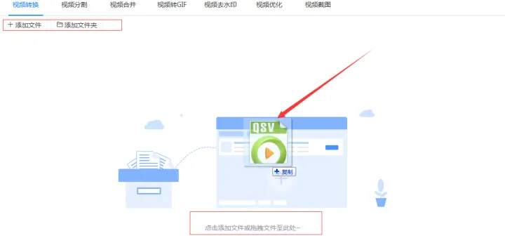 选择好“视频转换”功能后把从爱奇艺下载好的qsv格式的视频添加到软件中。添加的时候可以点击软件左上角的“添加文件”/“添加文件夹”按钮也可以直接把qsv格式的视频拖拽到软件。