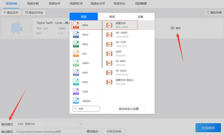 添加好qsv格式的视频后点击“输出格式”按钮设置输出的视频格式和视频分辨率,因为要把qsv格式转换成mp4格式,所以把输出格式中的视频格式设置为‘mp4’格式。为了达到好的效果一般把视频分辨率设置为和原文件相同分辨率的‘同原文件’格式