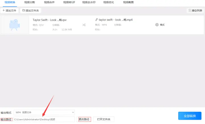 把“输出格式”设置为‘mp4同原文件’格式后对视频存储到电脑的“输出路径”进行调整。调整输出格式的时候可以在输入框中直接写入地址,或者把地址拷贝并粘贴到输入框中,也可以点击输入框右边的“更改路径”按钮选择路径。