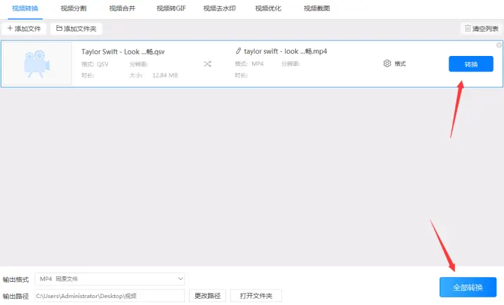 准备就绪后点击软件右上角的“转换”或者右下角的“全部转换”按钮把qsv格式转换成mp4。在转换的时候软件会出现一个进度条,当进度条到达100%时就表示已经转换好了,此时会有一个“打开”按钮覆盖在“转换”按钮上。我们只需点击“打开”按钮就能找到qsv格式转换成mp4的视频文件了。