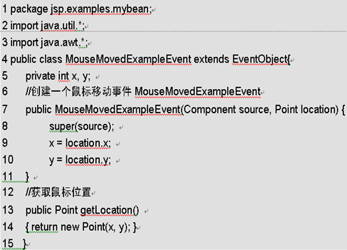 与事件发生有关的状态信息一般都封装在事件状态对象 (EventState Object) 中,这种对象是java.util.EventObject的子类。按设计习惯,这种事件状态对象类的名应以Event结尾。例如代码是一个鼠标移动事件实例。