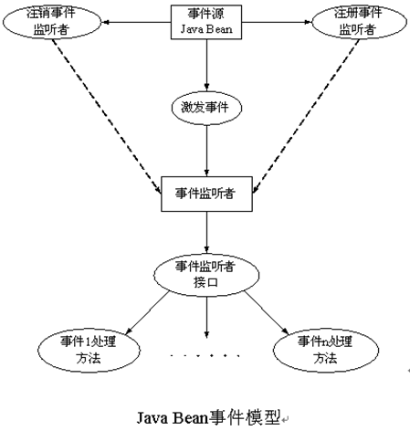 (3)事件:事件实际上是一种特殊的Java Bean,属性值的改变触发事件,事件激发相关对象作出反应,通过Java Bean注册对象事件监听者机制来接收、处理事件,它实现了Java Bean之间的通信。