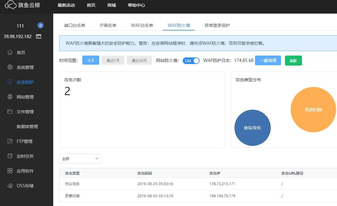 尤其是旗鱼云梯平台的服务器安全防护功能,能够实现waf防火墙拦截,还有白名单功能,自己的服务器加入白名单,任何攻击来到服务器犹如泥牛入海一般消失了。