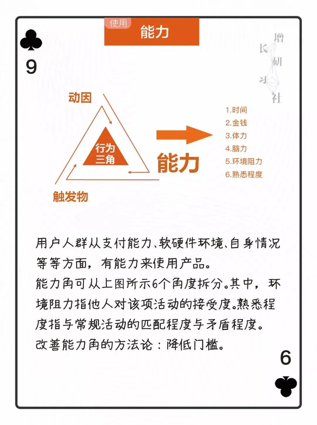 这也是在拆解增长八卦模型时,我们为什么一直强调 “找到增长方法的方法”——每个公司所处的行业都不尽相同,很难马上告诉你一个具体的招数立即解决增长问题,而是通过系统分析和要素拆解,提供用户增长的 check list,每个检核清单下提供解决这个环节的方法论(如解决能力角不够的时候我们用 “降低门槛”)和案例,与我们具体的商业场景相结合,就能生发出很多具体的增长方法,然后不断验证。
