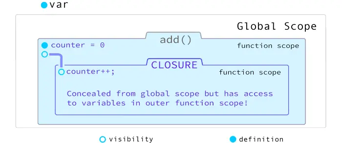 技巧?counter变量在全局作用域内隐藏。但我们仍然可以从全局作用域调用add()。换句话说,counter变量仍然是隐蔽的,但是我们可以以闭包的返回值从全局作用域中访问它。