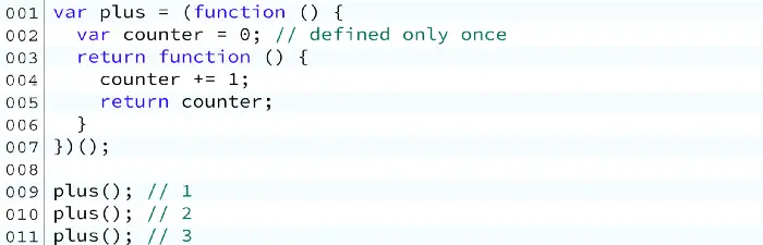 plus()被一个执行自身的匿名函数定义。在plus作用域内,将创建另一个匿名函数。它增加一个秘密变量counter,并将结果返回到全局作用域。