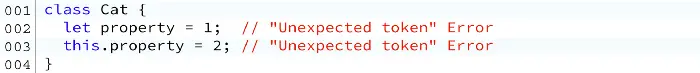注意,let(或var或const)只为该作用域创建一个局部变量。因此,不能从类方法访问它。 在类中,变量在其构造函数或方法中定义: