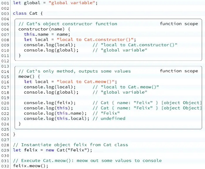 注意,因为对象felix实际上是在全局作用域内创建的,所以我们可以在类方法中访问它(但不能在类构造函数中访问,因为在构造函数中对象的实例仍然在被实例化)。 但是,既然我们可以简单地使用this关键字来指代相同的东西,那么为什么在喵()类中使用felix呢?在这里我们只是举个个例子。