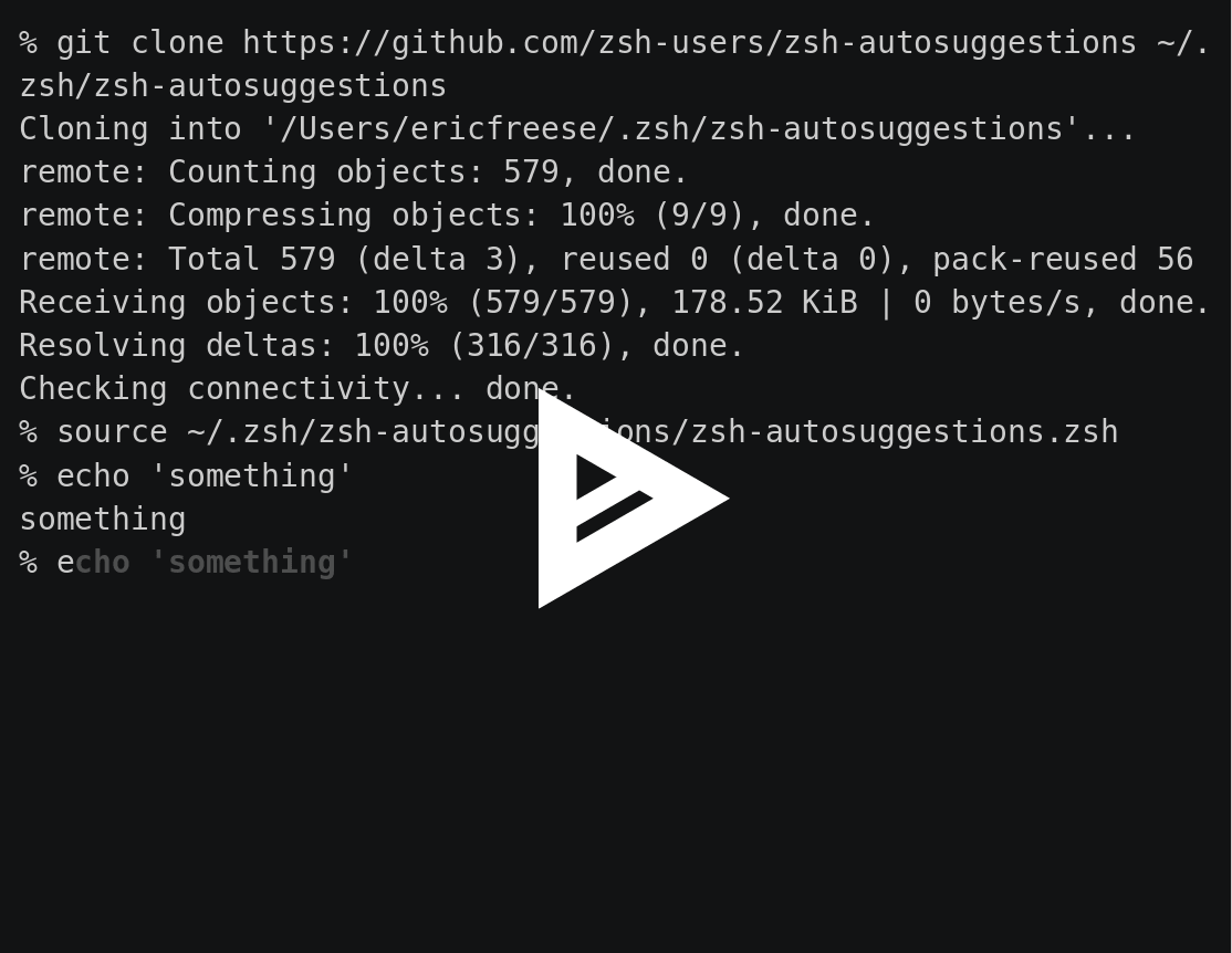 git clone https://github.com/zsh-users/zsh-autosuggestions ${ZSH_CUSTOM:-~/.oh-my-zsh/custom}/plugins/zsh-autosuggestions