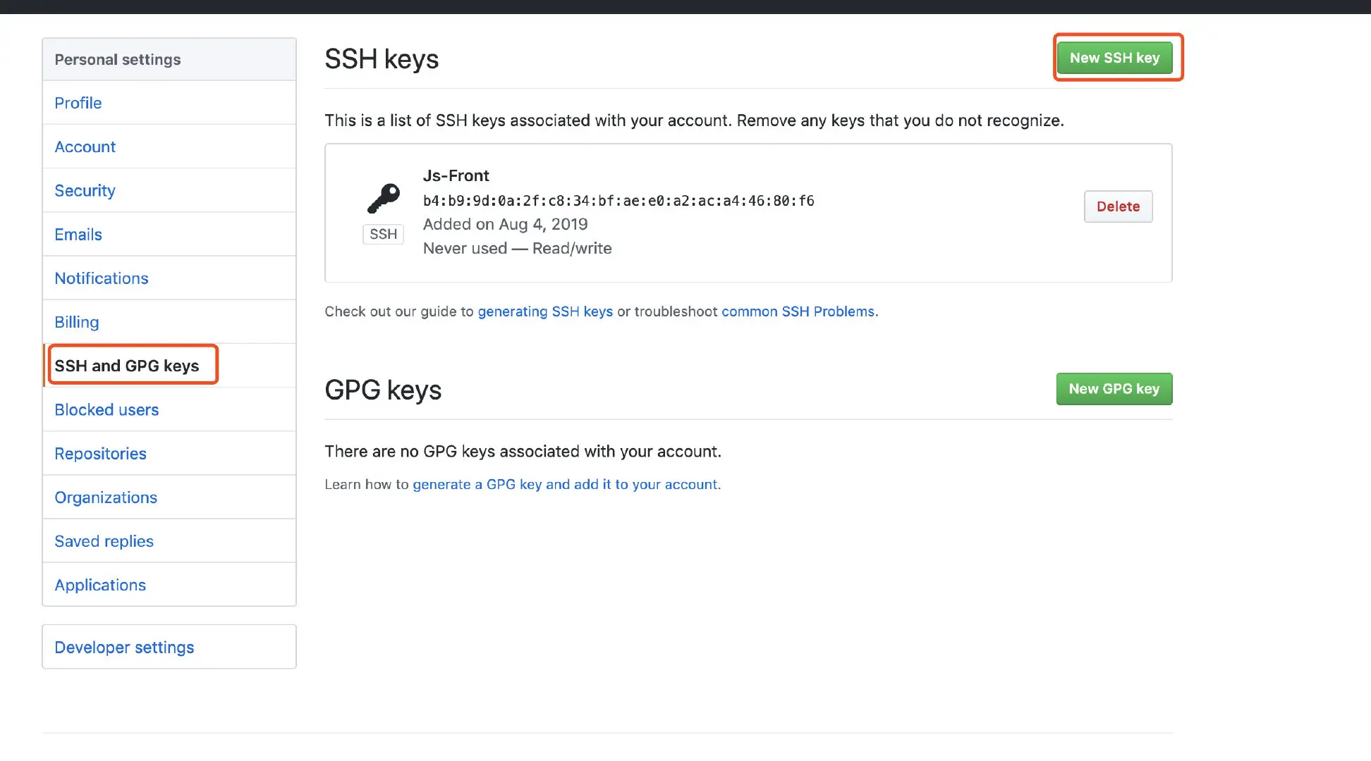 选择 SSH and GPG keys,点击 New SSH key创建。