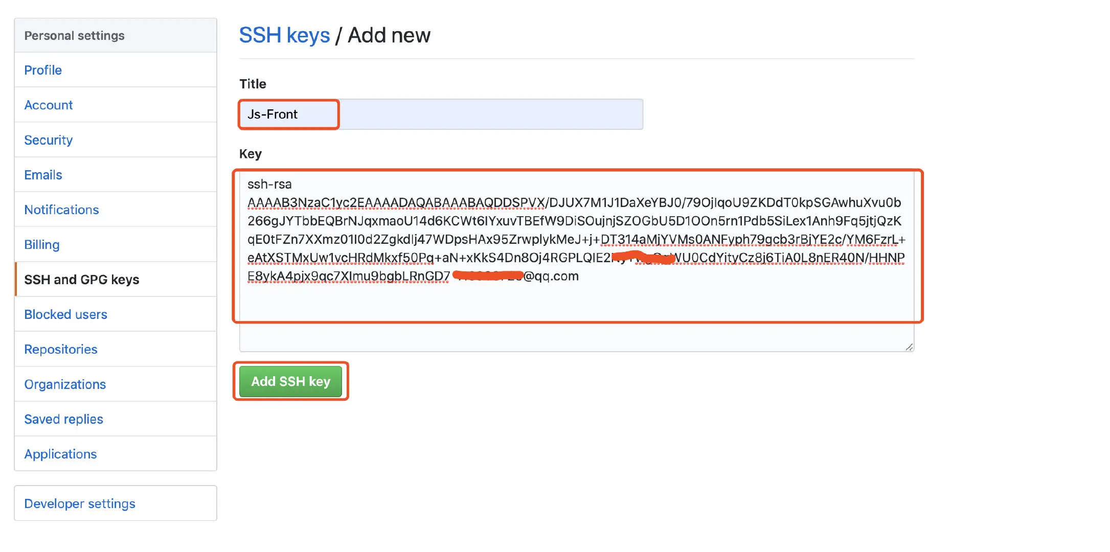 输入Title 和 Key(key是我们之前在id_rsa.pub 复制的那串),然后点击 Add SSH key 添加。