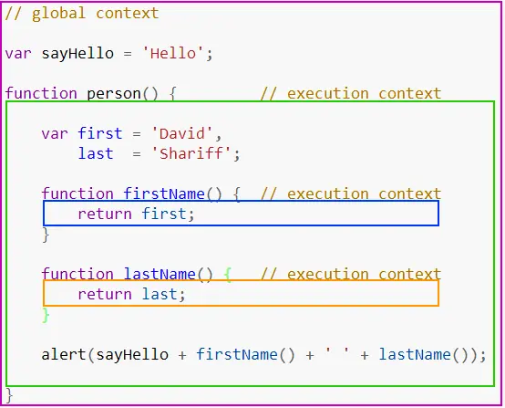 在网上你可以读到很多关于作用域的文章,为了便于理解本文的内容,我们将 执行上下文 当作代码的 执行环境/作用域。现在就让我们看一个例子:它包括 全局和函数/本地执行上下文。