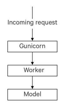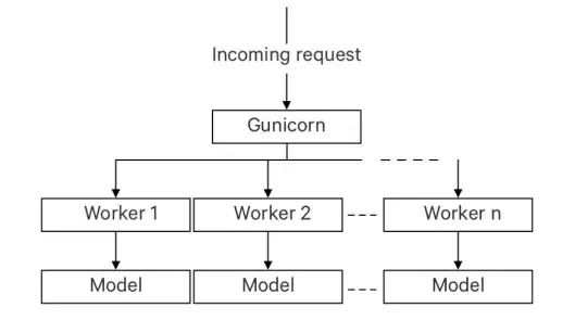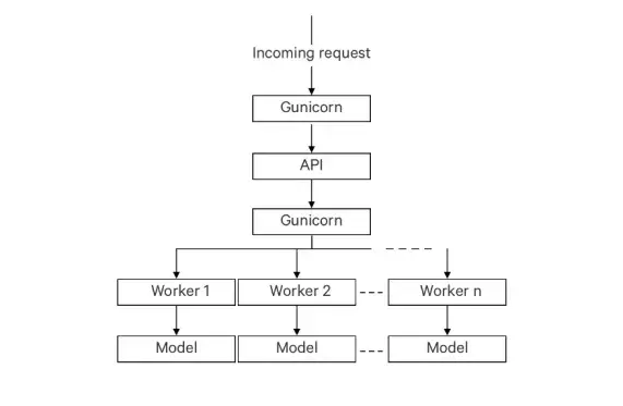 该方法的不同之处在于使用gunicorn worker的功能来平行工作。为此,在之前的模型中需添加另一个层。先前定义的体系结构可以接收多个请求,并在几个worker中同时处理这些请求。将此当作优势。最终模型如下。