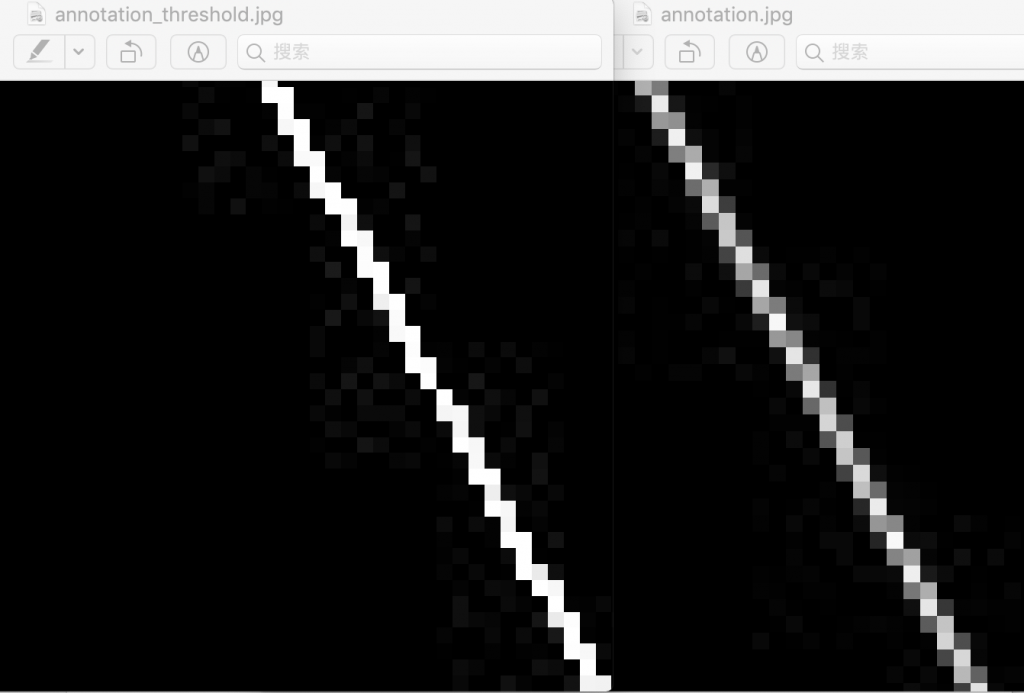 上面是原图和输出图片放大后的对比图,左边是二值化的图片,右边是 Sketch 输出的图片,二值化后的图片只有黑白两种像素,那么这样就得到了一张二值化处理后的标注图: