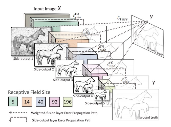 axis 设置为 3,那么输出为 [1, 224, 224, 5],再执行一次 1×1 convolution 得到 [1, 224, 224, 1] 的输出。最终这个输出就是边缘检测的结果了,以上就是 HED 网络正向传播的过程。