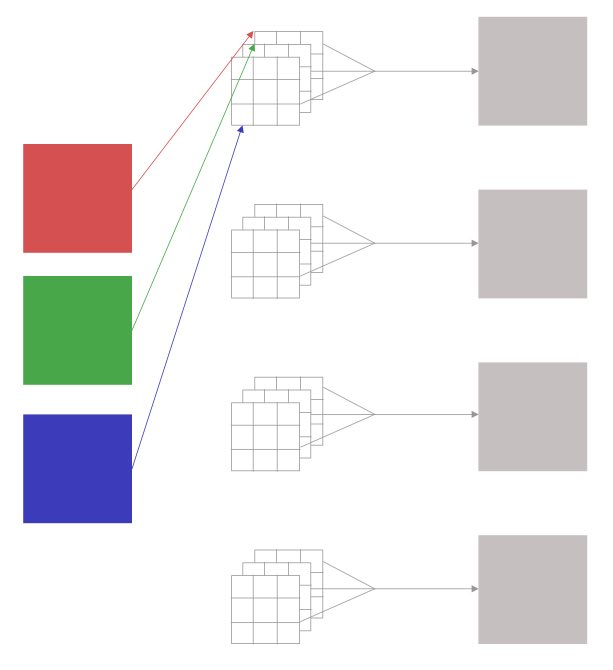 举个例子说明一下什么是深度可分离卷积,对一张 224*224 的彩色 3 通道图片进行卷积操作,卷积核为 3*3,输出四通道矩阵,普通卷积的过程示意如下: