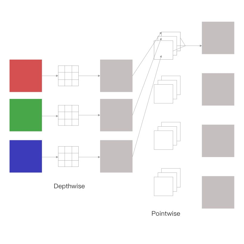 对比两个卷积过程,直观上来看深度可分离卷积的计算量明显比普通卷积少了很多。深度可分离卷积的计算量为: 3*3*3*224*224 + 3*4*224*224,普通卷积的计算量为:3*3*3*4*224*224,为深度可分离卷积的 2.77 倍,如果输出通道数较大,则最终趋近于 9 倍。