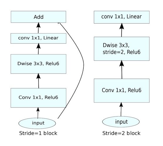 之后 Google 又推出了 MobileNet V2 网络,MobileNet V2 的主要贡献是在MobileNet V1 的基础上提出了线性瓶颈层(Linear Bottlenecks)和反转残差块(Inverted Residuals), block 示意图如下: