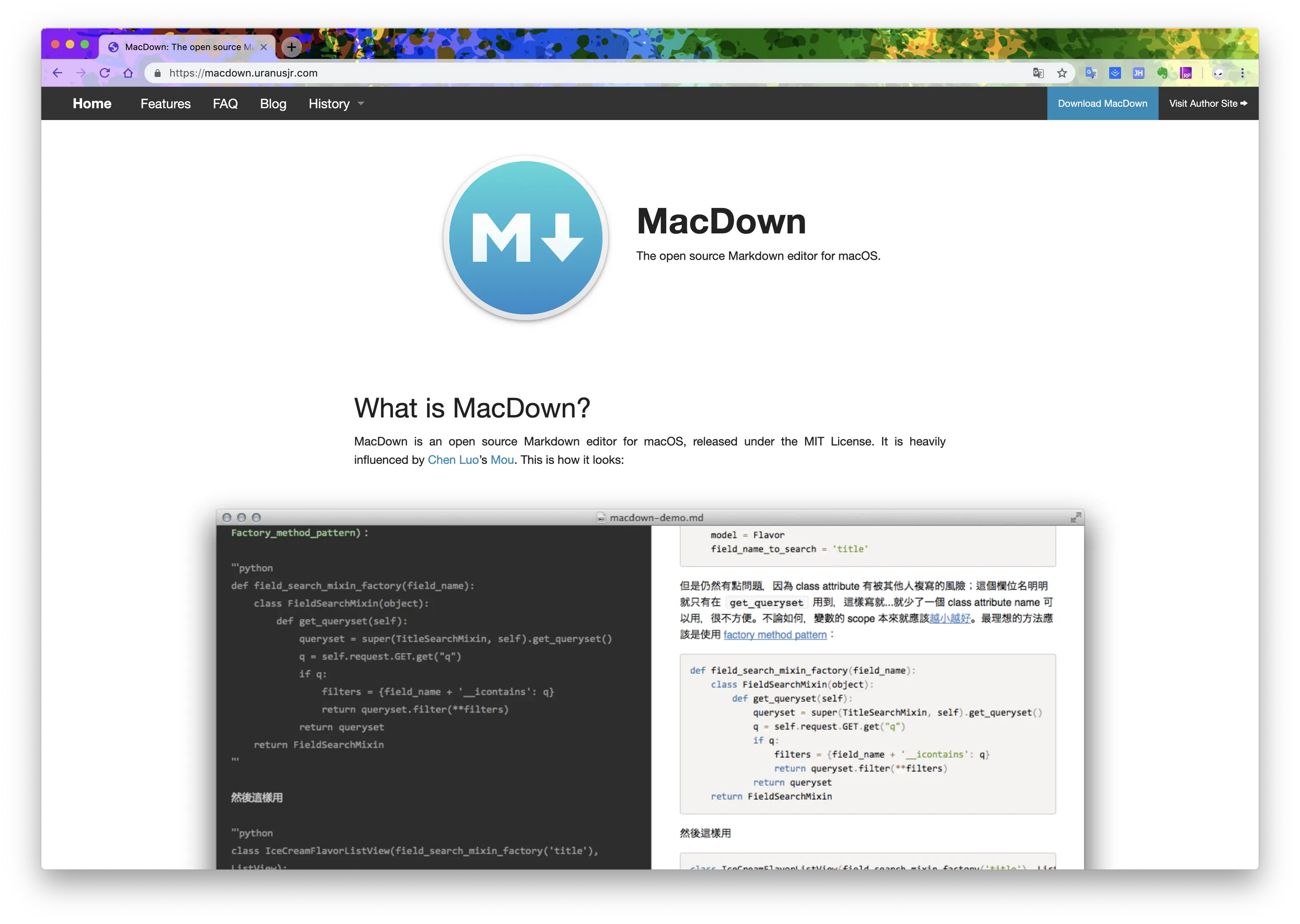 Macdown是一款开源软件,它和收费软件Mou还有一段小插曲,作者也很诚恳的在网站首页表达了初衷,当然立场不同笔者也不做评价。Mou笔者也体验过,和Macdown对比后就放弃了,看来它确实会降低Mou的销量,额...我们不做评价...。Macdown是设计为编辑单个md文件,不能说是这么设计的,但就目前的体验确实是这样。