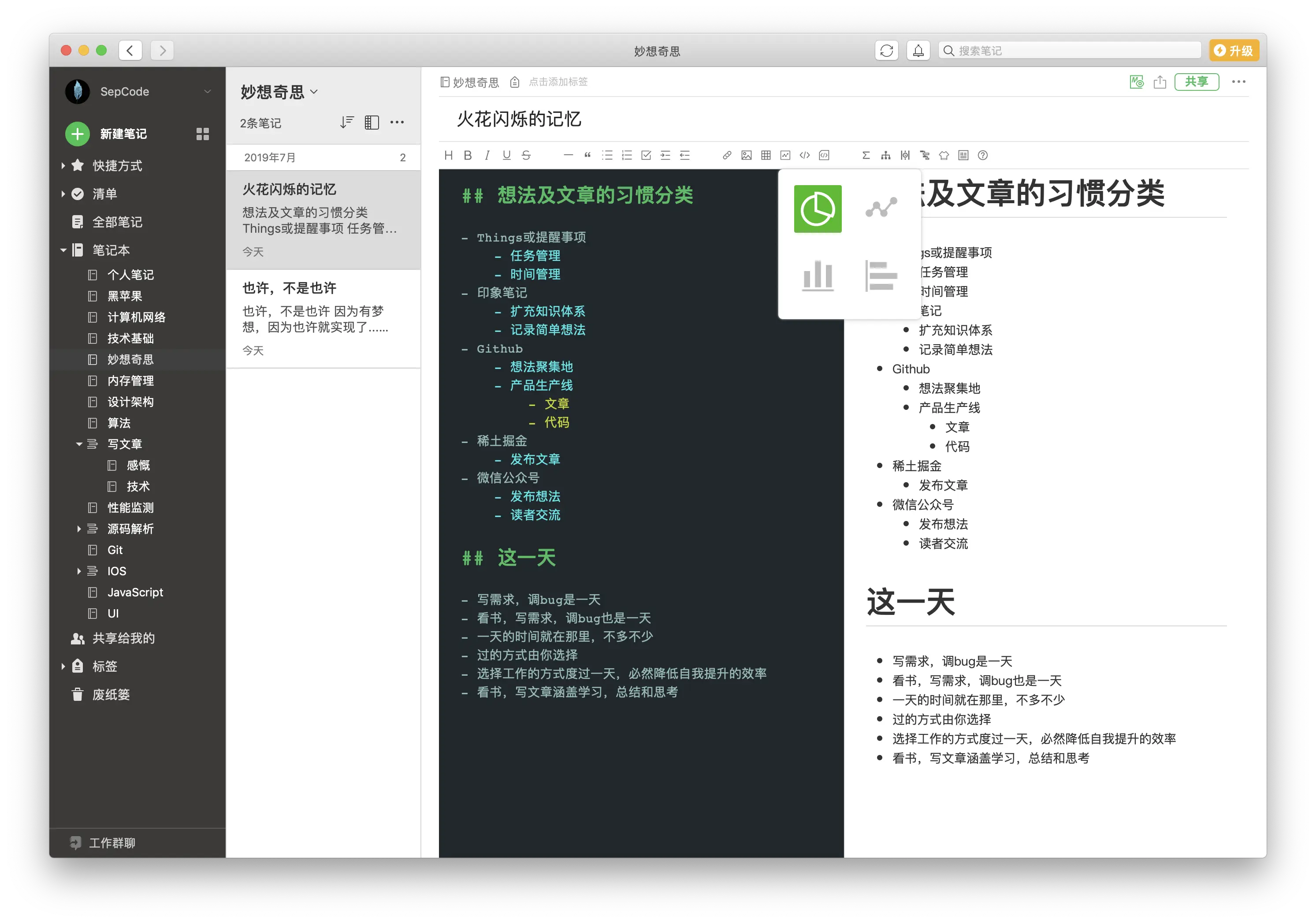Tonight~ we are young。写到这里时不知为何脑海中就奏起了这个旋律,也许印象笔记接触的更早吧,再次使用时里面还有之前保存的折腾黑苹果的相关帖子,确实好些年了。那就跑偏一下,玩黑苹果的话只需要知道一个远景论坛就行了,就像玩路由器去恩山无线,玩破解去吾爱破解一样,你所需要的一切基本都可以在这里学到。言归正传,刚开始接触Markdown时,也比较过印象笔记。当时还不支持创建md文件,需要用到马克飞象的插件,而这个插件居然还是收费的。所以你懂的不考虑,对,就是不考虑。现在你再使用它的话,相信不会再因此失望了。目前印象笔记处于7周年快速迭代期,一周一个新功能。