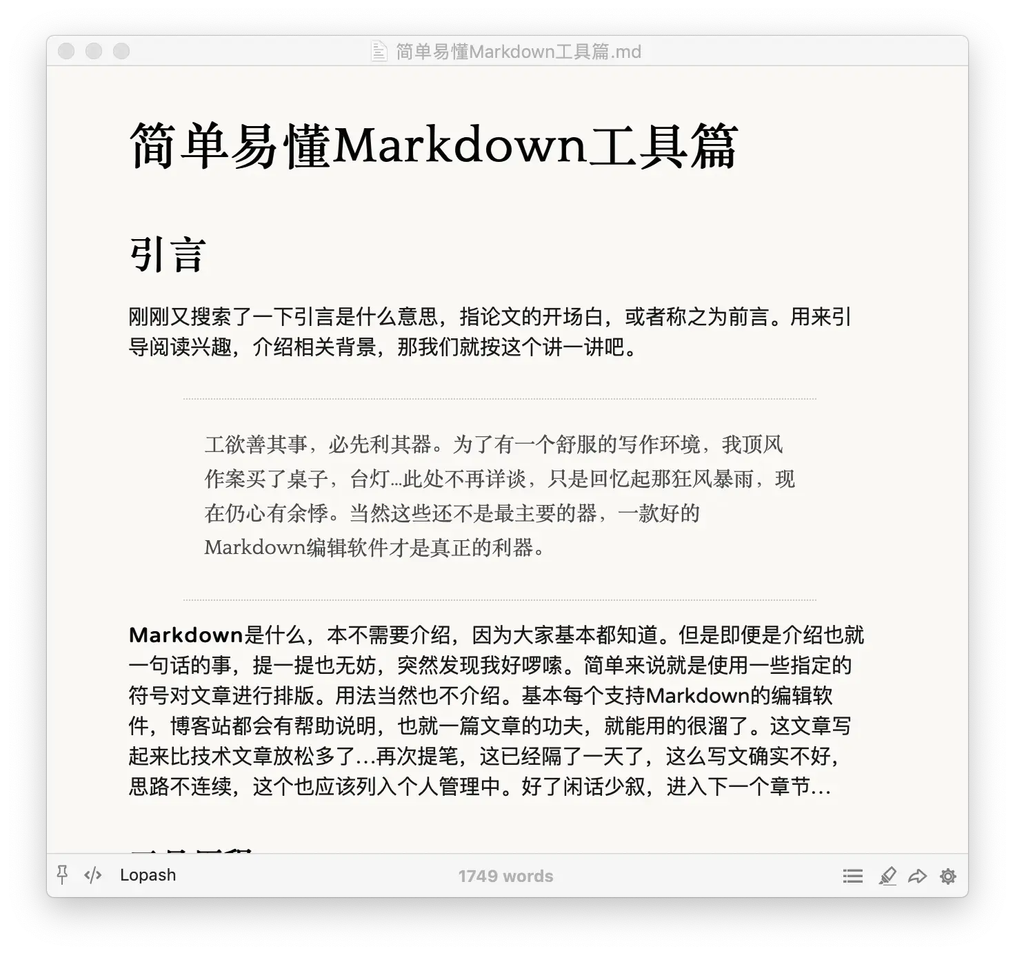 它就像Bear和Ulysses的结合体,因为在这里你可以看到他们的影子。界面风格更偏向于Ulysses,但是使用标签分类管理,同时提供了快捷预览。心无旁骛,专心写作