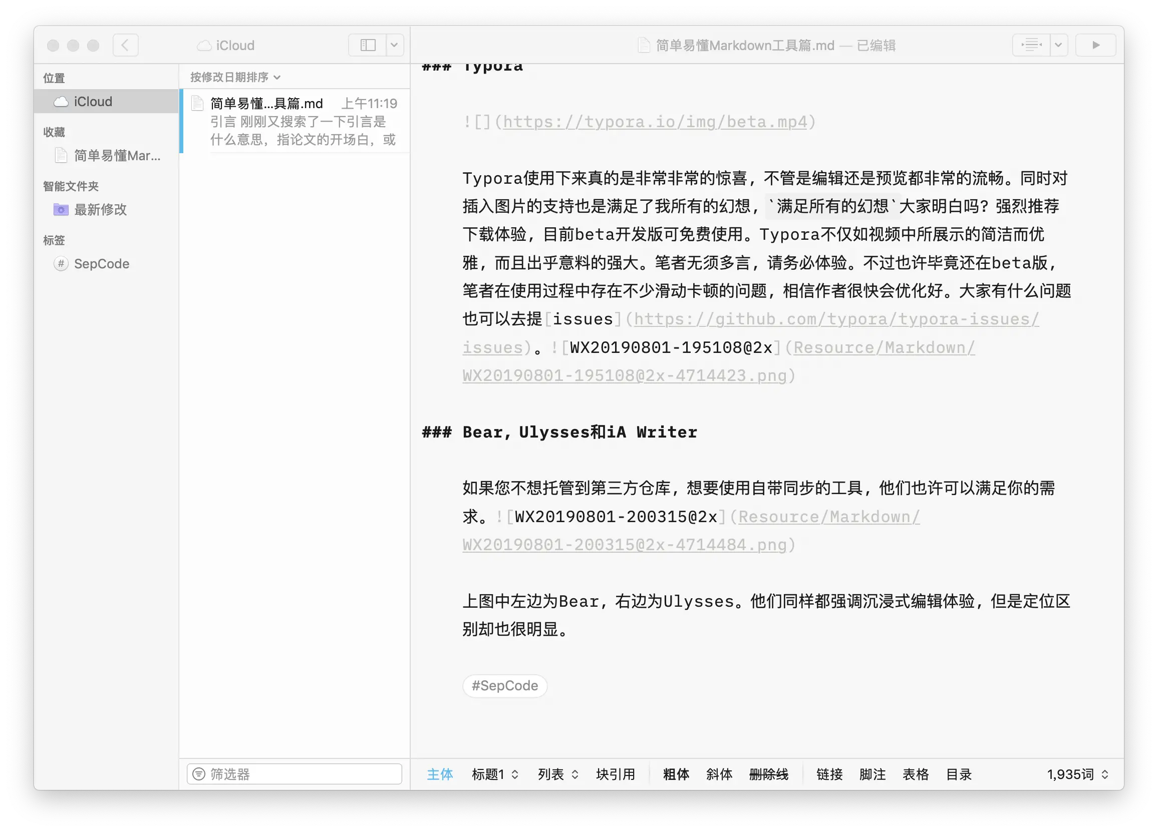 上图中左边为Bear,右边为Ulysses。他们同样都强调沉浸式编辑体验,但是定位区别却也很明显。