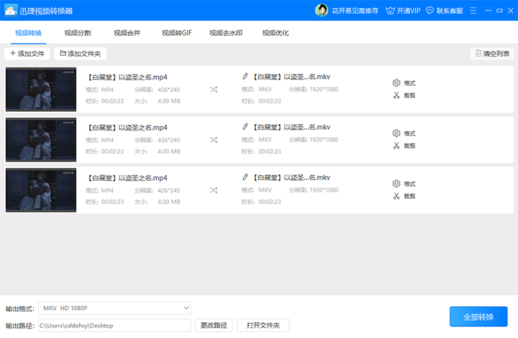 4、最后可以点击全部转换将mp4视频转换成mkv高清视频了,等待软件转换到100%,那么视频格式就转换完成了。