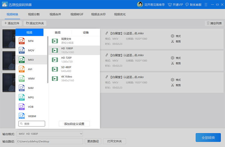 2、在软件左下角输出路径中选择设置桌面为保存mkv高清视频的地址,点击更改路径然后选择桌面即可,也可以将保存路径输入到路径框中,