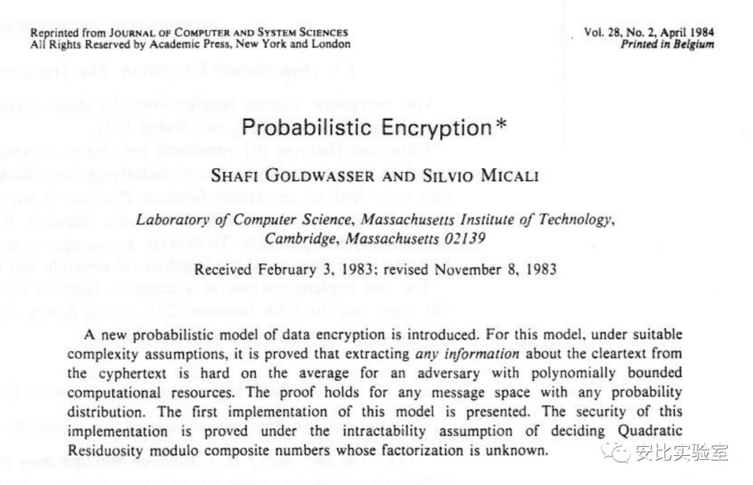 但是这个定义太完美,以至于使用的加密算法都很难满足这个安全性定义。后来 Goldwasser 与 Micali 等人写了另一篇载入史册的经典『概率加密』[2]。