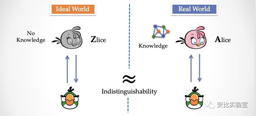 这里还有个前提,理想世界必须是算法可构造的。然后,有一个「神」,他通过算法「模拟」了一个「理想世界」,其中构造了一个算法叫做 Zlice,她没有「知识」作为输入,也即「零知识」;除此之外,「理想世界」与「现实世界」一模一样。