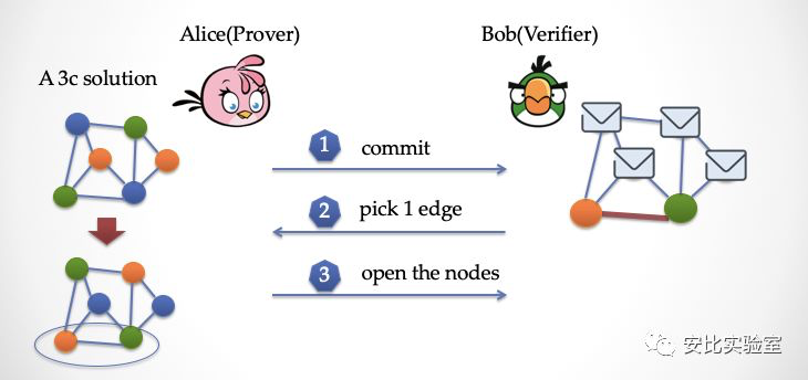 - 第三步: Alice 打开指定边的两端顶点的纸片,Bob检验两个顶点的颜色是否相同,如果不同则通过,如果相同则失败