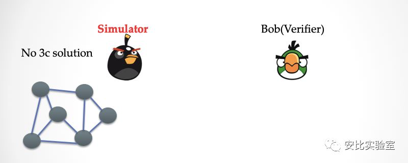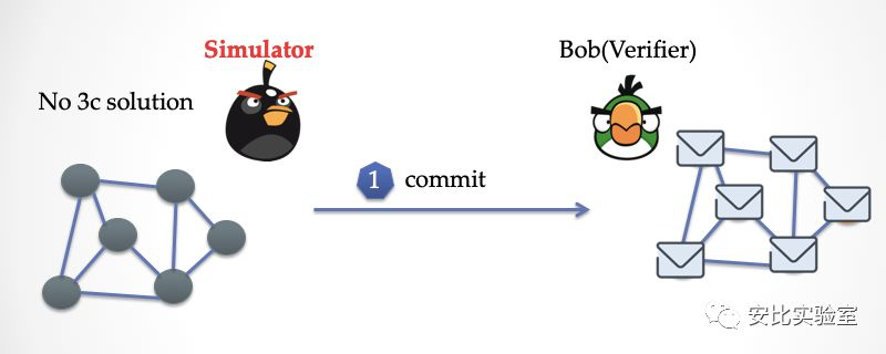 在「理想世界」中,跟 Bob 对话的是一个「模拟器」,它模拟出了整个世界的样子。Bob 按照三染色问题的交互协议进行交互。模拟器并没有一个三染色答案,它索性把所有的顶点都染成了灰色。