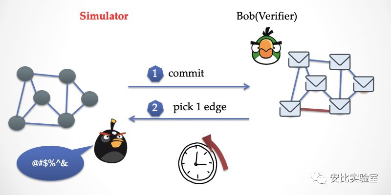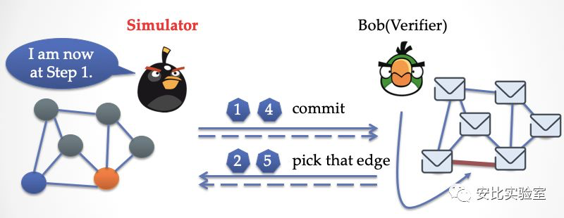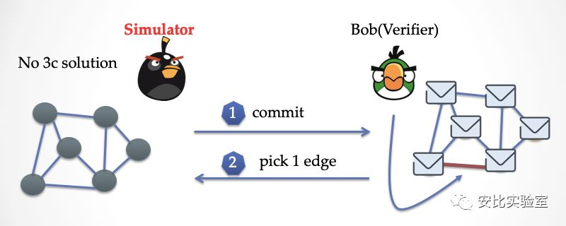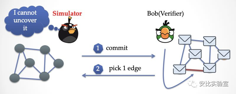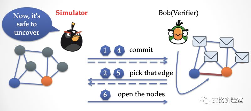 这时候模拟器就可以放心地打开纸片,让 Bob 检查。Bob 很显然会被骗过。然后 Bob 一轮轮地重复这个过程,每一次模拟器都能用时间倒流的方式骗过 Bob。