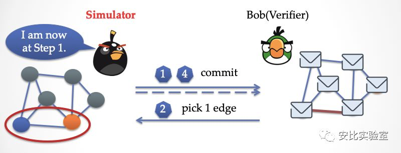 首先,模拟器模仿 Alice ,把每个顶点用纸片盖起来。然后发给 Bob。