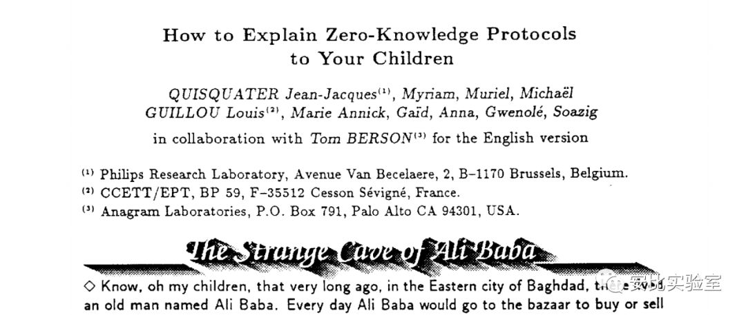 这个故事其实来源于一篇论文『如何向你的孩子解释零知识证明』(How to Explain Zero-Knowledge Protocols to Your Children)[3],发表在1989年的美密会议上。