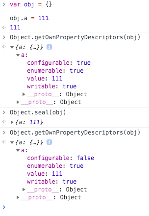 图中,Object.seal 使用之前 configurable 是 true,使用之后变为 false。