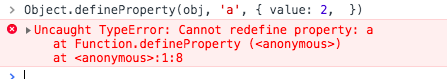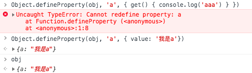 不能把 a 从数据描述变为存取描述,但是可以通过 Object.defineProperty 改变它的 value,等同于 obj.a = '我是a'