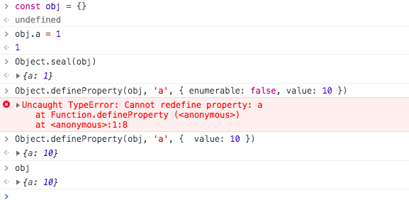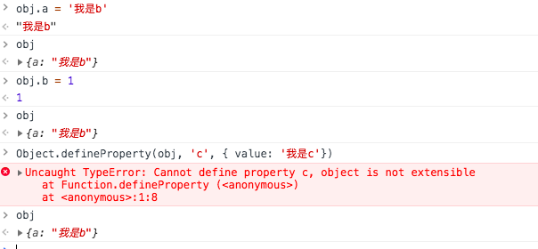 用 . 号方式扩展属性静默失败,用 Object.defineProperty 扩展则直接报错 Uncaught TypeError: Cannot define property c, object is not extensible,对象不可扩展了。