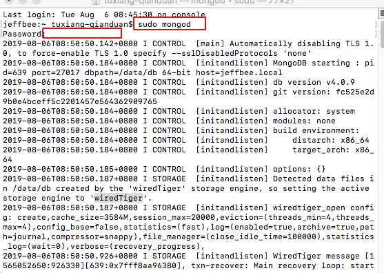 打开terminal命令行工具输入命令 sudo mongod 启动服务(记住要加sudo,不加会提示权限错误),输入密码就可以看到启动日志了