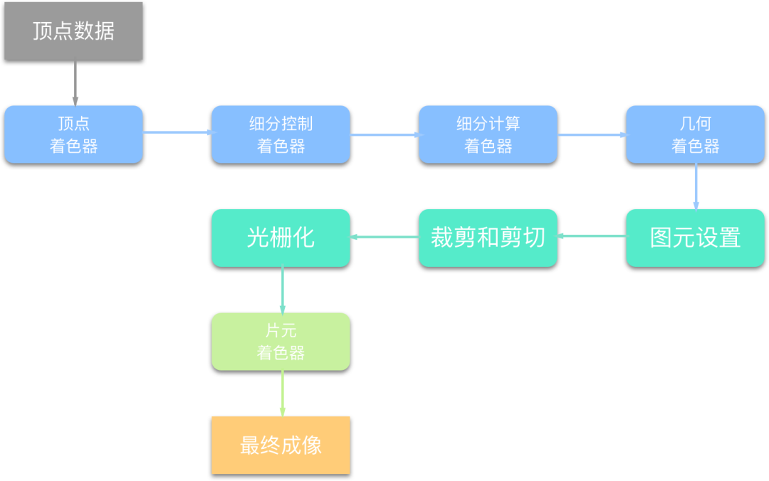 这些图元数据流入 OpenGL 中,传入顶点着色器(vetex shader),然后顶点着色器对其进行着色器内部的处理后流出。之后可能进入细分着色阶段(tessellation shading stage),其中又有可能分为细分控制着色器和细分赋值着色器两部分处理,还可能会进入几何着色阶段(geometry shading stage),数据从中传递。最后都会走片元着色阶段(fragment shading stage)。