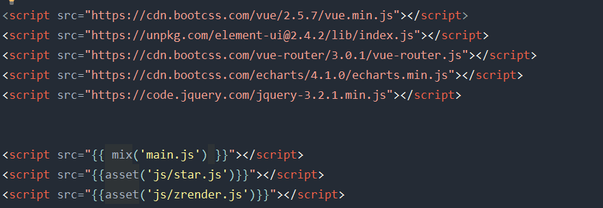 2. 在resources/views文件找到index.dlade.php文件,里面是引入别的文件(本项目不是我从头到尾的开发),项目写的比较乱,我也整理了一下,摸出cdn引入的位置,最后将代码引入: