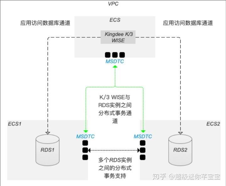 金蝶K/3 WISE和阿里云RDS for SQL Server兼容集成的核心关键是安全改造,要实现运行于ECS中的K/3 WISE与RDS for SQL Server之间信任安全的分布式事务支持是最大的难点。阿里云RDS for SQL Server 通过在专有网络内部,利用分布式事务白名单的机制打通底层独立网络通道,隔离网络环境,实现安全的分布式事务支持,系统实现架构图如下: