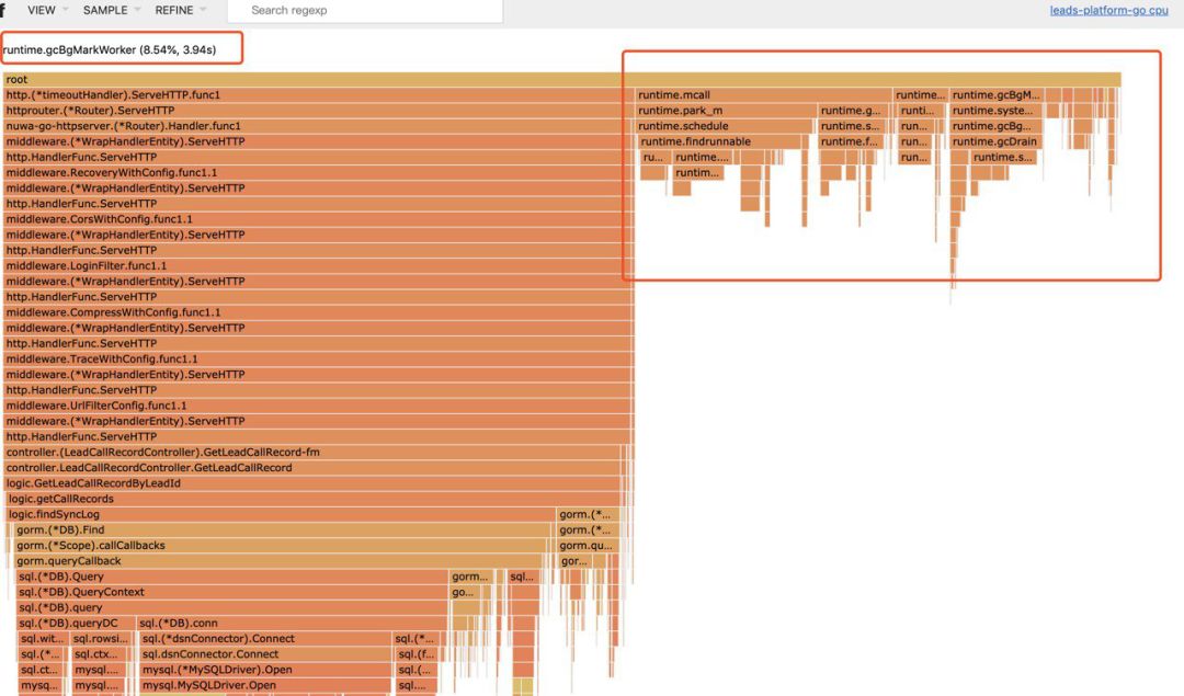 分析此图可以发现,cpu 资源的半壁江山都被 GetLeadCallRecordByLeadId 这个函数占用了,这个函数里占用 cpu 最多的又大多是数据库访问相关的函数调用。由于 GetLeadCallRecordByLeadId 此函数业务逻辑较为复杂,数据库访问较多,不太好具体排查是哪里出的问题,所以我把这个方向的排查先暂时搁置,把注意力放到了右边那另外半壁江山。