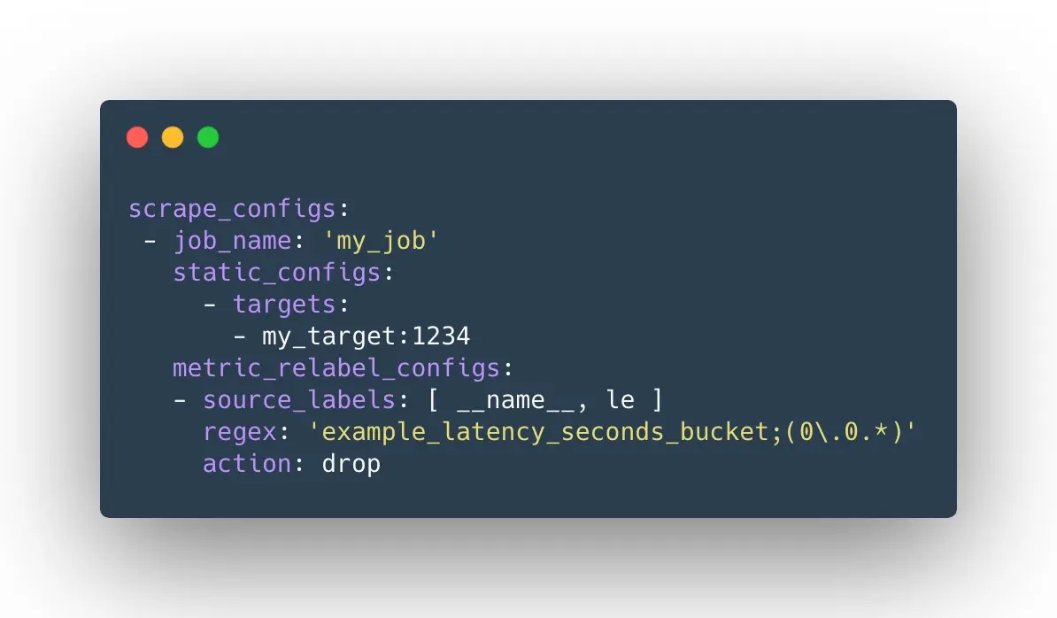 其中,example_latency_seconds_bucket 用来匹配标签 __name__ 的值,'0.0.*' 用来匹配标签 le 的值,即 le 的值为 0.0x。然后将匹配到的样本丢弃。
