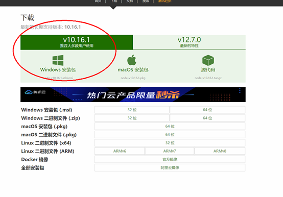 1、 下载node并安装,地址:http://nodejs.cn/download/,下载稳定版本如图: