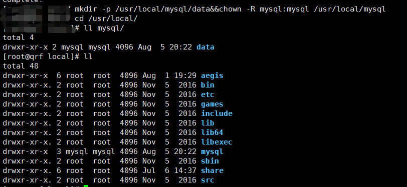 mkdir -p /usr/local/mysql/data&&chown -R mysql:mysql /usr/local/mysql