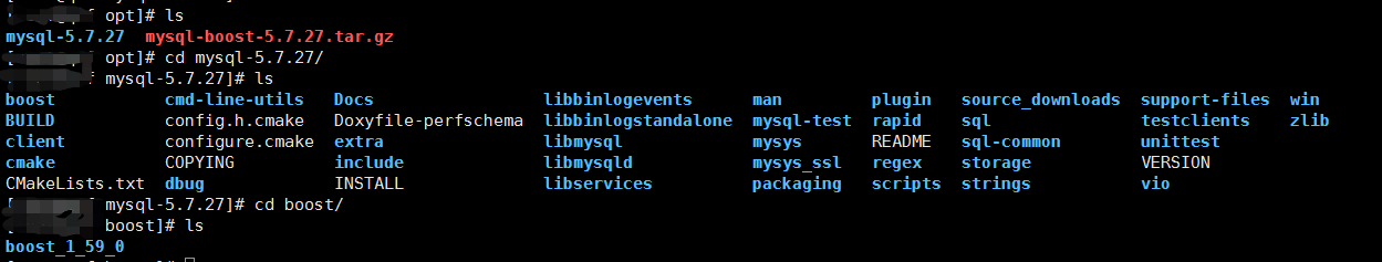 6、输入命令ls查看mysql下的目录和文件并进入到boost目录确认boost的版本(为了接下来的编译安装)我这里是boost_1_59_0版本