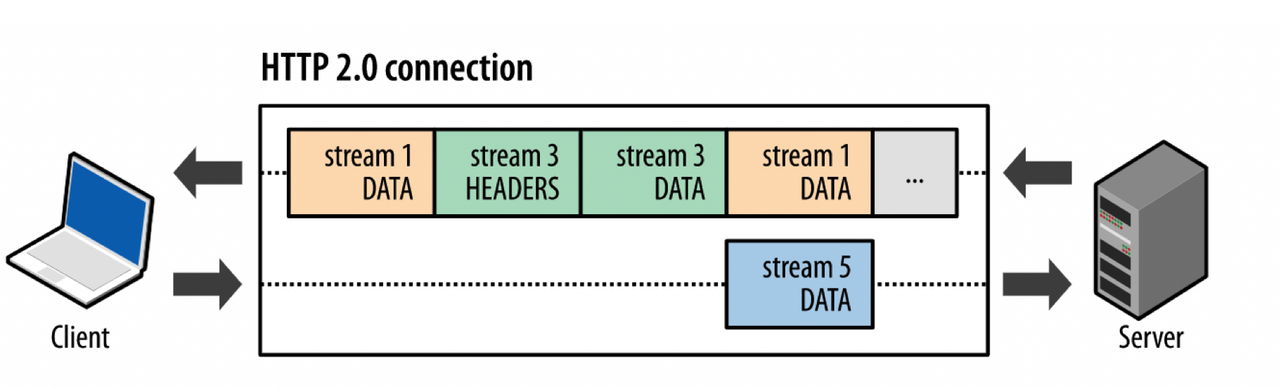 在http2.0中,多路复用可以很好的解决这些问题,因为引入了新的二进制分帧层,一条tcp连接可以承载任意数量的双向流,所以当发起多个并发请求时,这些请求-响应流就可以共用一个tcp连接,不同流的帧可以交织,通过流标识符识别帧,再通过每个流中帧到达的顺序进行组装帧,而不用等待第一个请求的响应发送完,再发送下一个请求,很好的解决了http队头阻塞的问题。如下图所示: